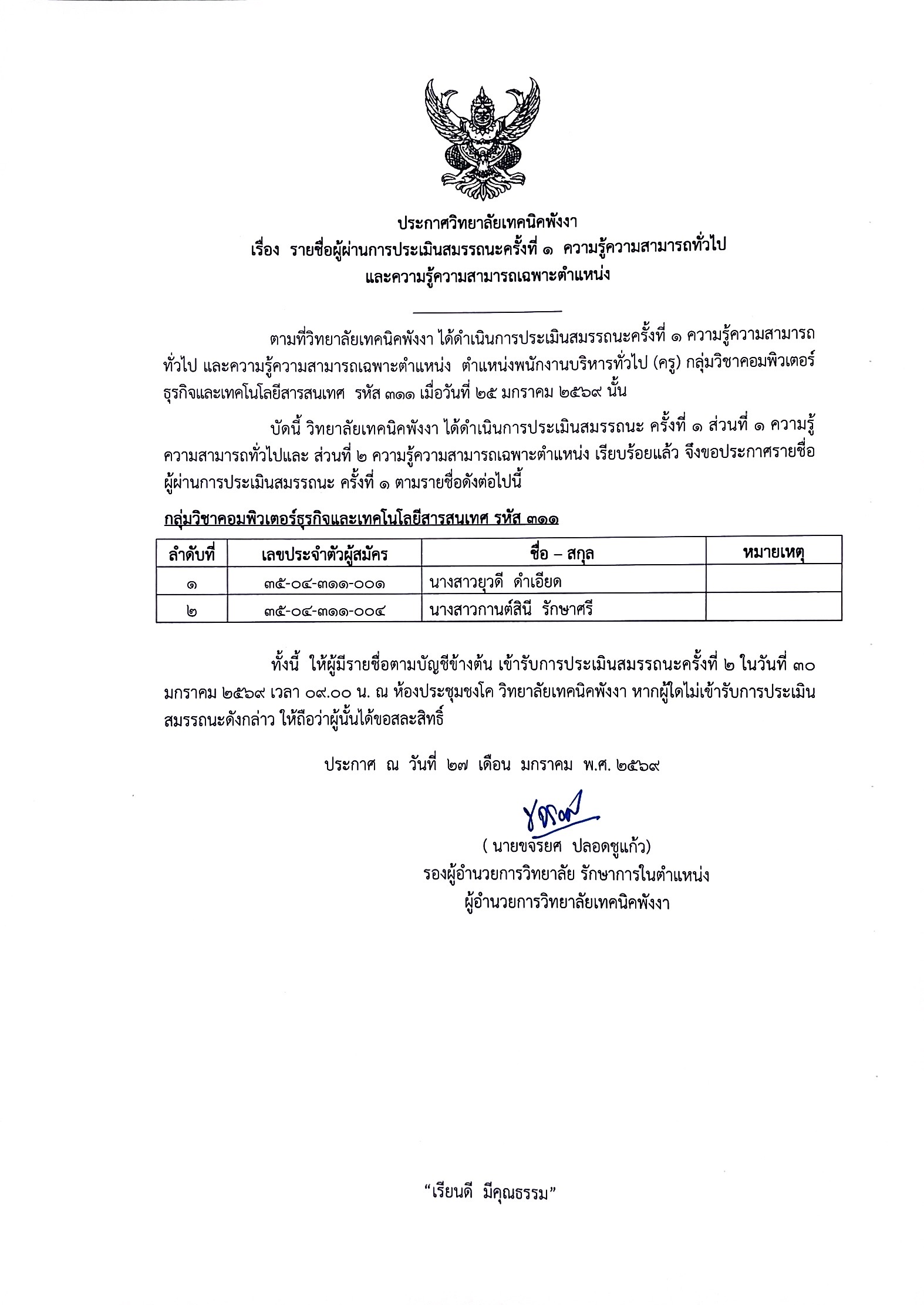 ประกาศ รายชื่อผู้ผ่านการประเมินสมรรถนะครั้งที่ 1 ความรู้ความสามารถทั่วไปและความรู้ความสามารถเฉพาะตำแหน่ง(27มค2569) 27 ม.ค. 2569ปริญญา หมายดีข่าวรับสมัคร