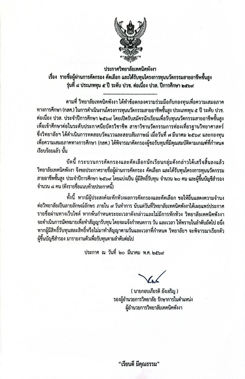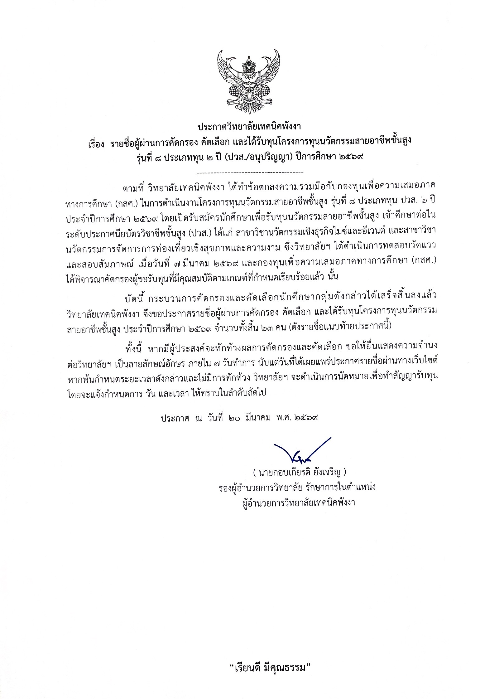 วิทยาลัยเทคนิคพังงา ร่วมกับ กองทุนเพื่อความเสมอภาคทางการศึกษา (กสศ.) ขอแสดงความยินดีกับนักศึกษาผู้ผ่านการคัดกรองและได้รับทุนนวัตกรรมสายอาชีพชั้นสูง ระดับประกาศนียบัตรวิชาชีพชั้นสูง (ปวส.) จำนวนทั้งสิ้น ๒๓ ราย ใน ๒ สาขาวิชาศักยภาพสูง ได้แก่: